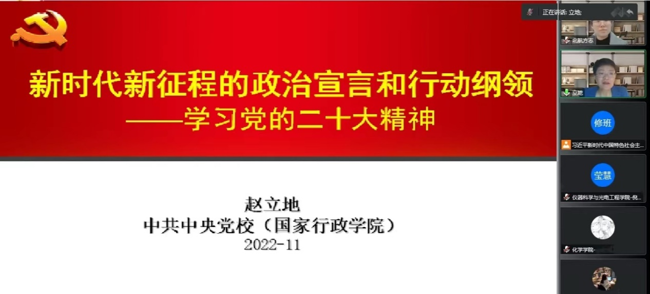 赵立地分析了党的二十大报告的结构框架,分别从“伟大变革-过去5年工作和新时代10年伟大变革的重大意义”、“光辉旗帜-新时代中国特色社会主义思想的世界观和方法论”、“使命任务-以中国式现代化推进中华民族伟大复兴的使命任务”、“自我革命-伟大自我革命引领伟大社会革命的重要要求”、“团结奋斗-团结奋斗的时代要求”五个方面详细解读了党的二十大报告原文。她提到,“五个牢牢把握”是对党的二十大报告最精准的解读、最权威的辅导,为我们学习宣传贯彻党的二十大精神提供了重要遵循。