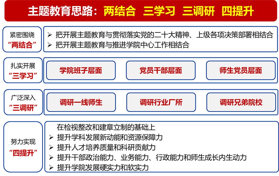 党委会制定了主题教育实施方案和两个子方案,将理论学习、调查研究、推动发展、检视整改贯通起来,着力把习近平新时代中国特色社会主义思想转化为坚定理想、锤炼党性和指导实践、推动工作的强大力量。