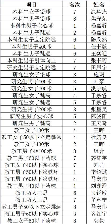 赓续拼搏精神,铸就崭新辉煌,为期两天的运动会圆满闭幕,在动力师生的共同努力之下,运动员们取得优异成绩。多个项目斩获前8,四个项目位居第1,教职工获甲组团体第九名(共21支队伍),本科生获甲组团体第六名、研究生获甲组团体第五名(共25支队伍)、广播操获一等奖、虎扑足球