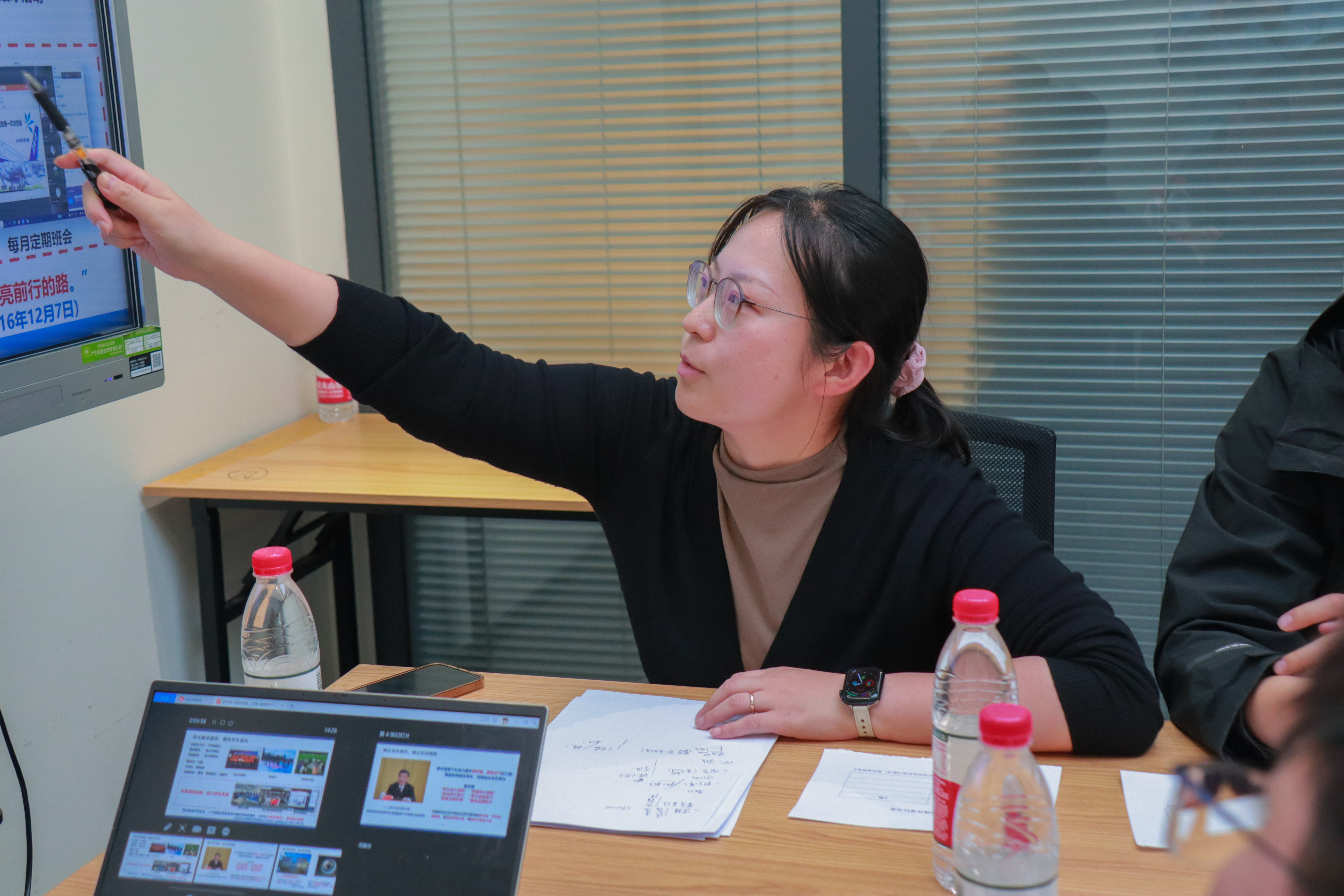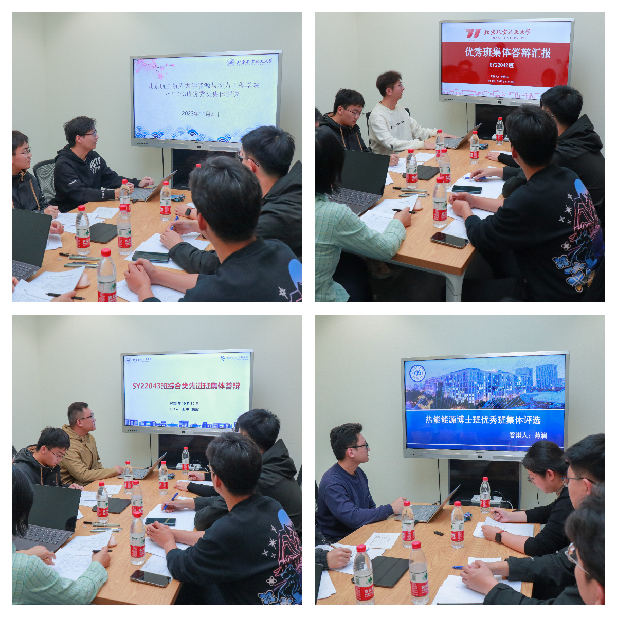在F-721开展优秀班集体评选答辩。教师王庆华,专职辅导员李天韵、刘亦泽,兼职辅导员叶豪、赵玉禄、张权以及sy21043、sy22042、sy22043与热能能源博士班的同学代表参与此次活动,活动由魏江楠主持。