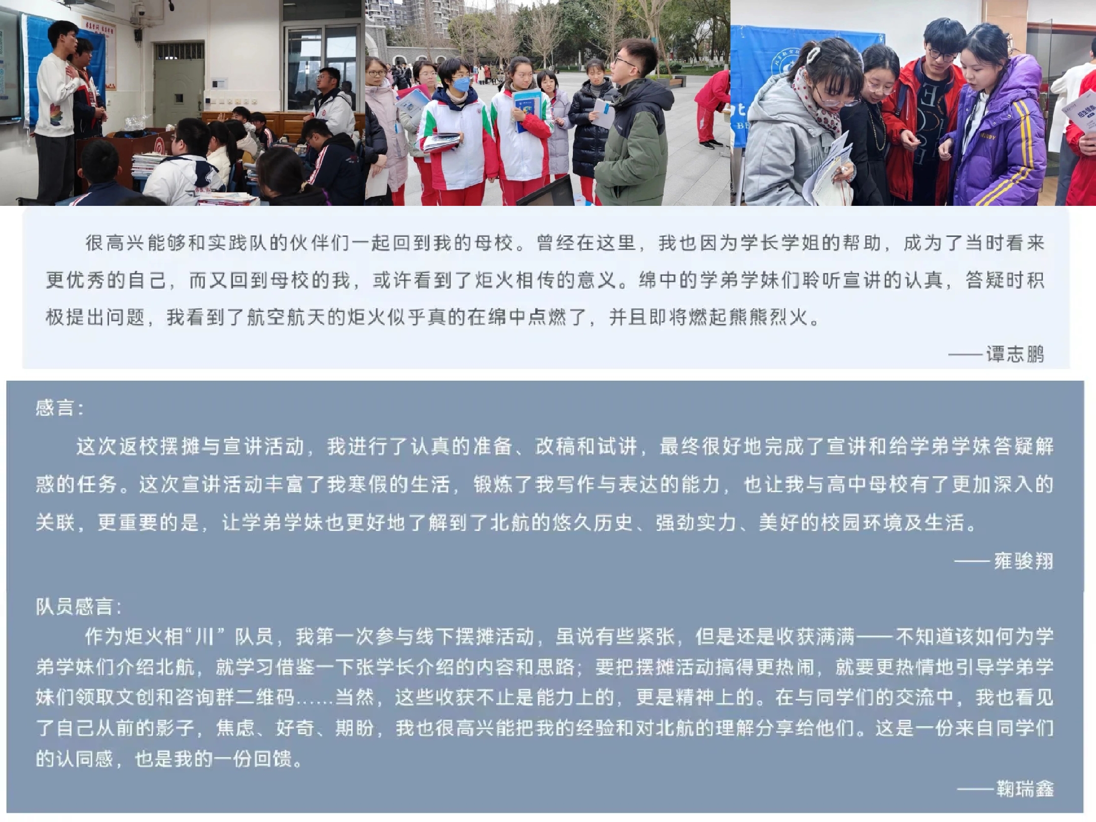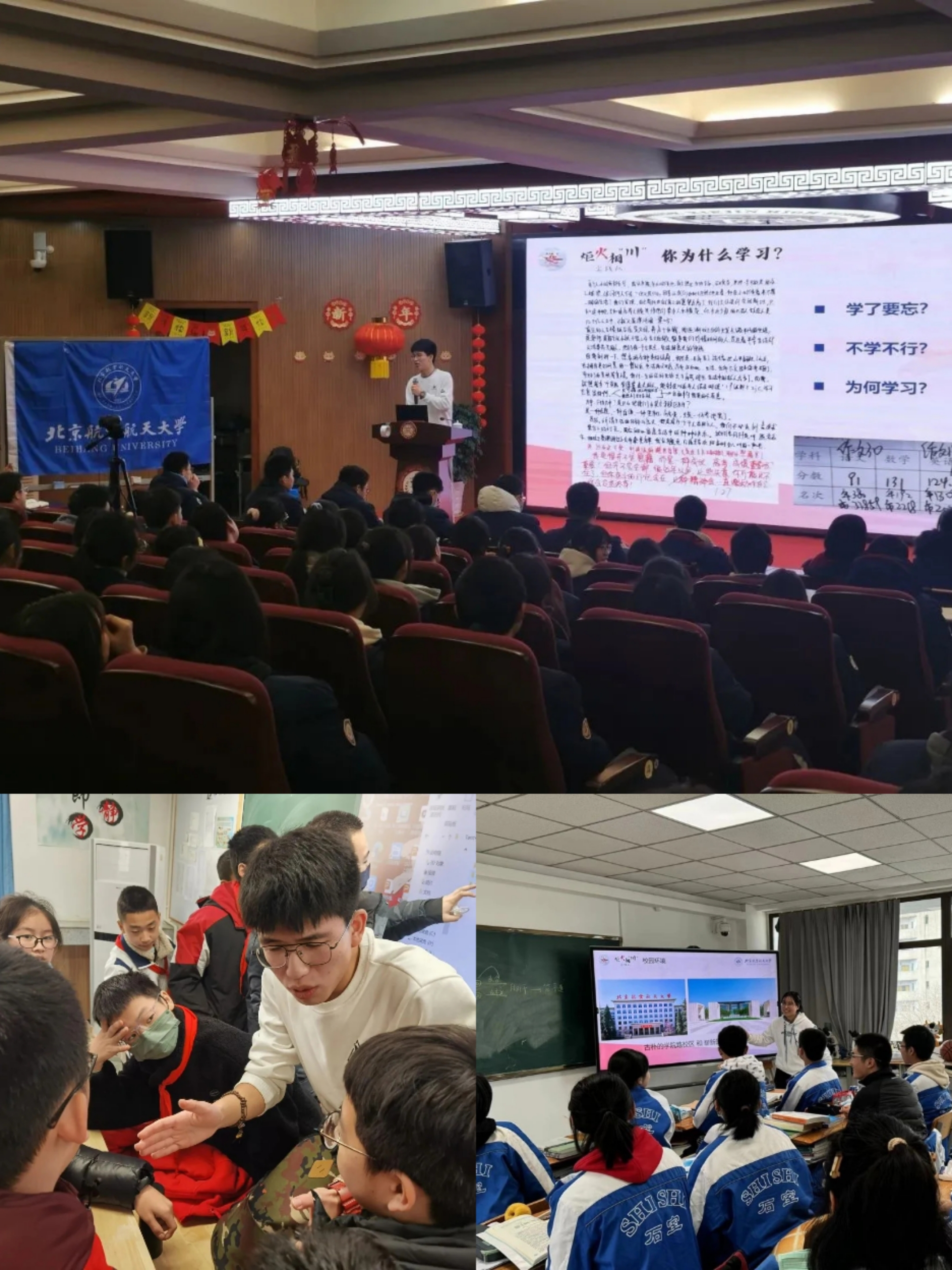 · 对于来自成都树德中学外国语校区的初中生,实践队聚焦学习态度,树立正确的学习观念并讲述北航生活和专业概览;