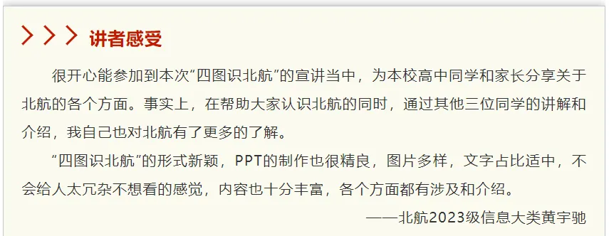 北航的学科建设方针是:顶尖工科,一流理科,精品文科,优势医工。我们的宣讲同时聚焦上述四类学科,让同学们对于北航的学科构建有更客观,更全面的认知。