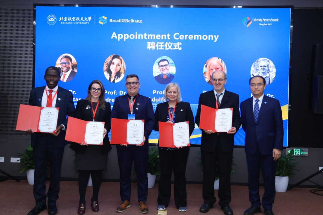 院士Julio Romano Meneghini在内的23位外国专家参加两场大会,并借此机会共商前期已签署合作协议的“北航-圣保罗大学绿色航空实验室(BUGA Lab)”在杭州校园落地建设事宜,为Julio Romano Meneghini教授和Hamilton Varela教授颁发聘书。