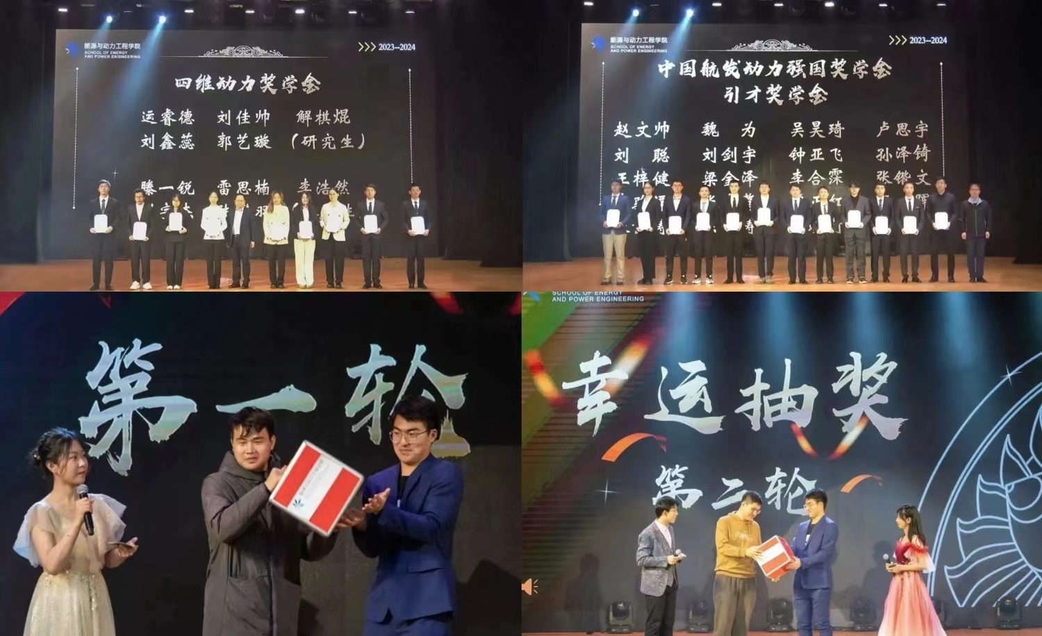晚会期间进行了颁奖仪式。北京全四维动力科技有限公司常务副总经理李宝清为四维动力奖学金获奖同学颁奖。虎扑足球 党委副书记谷萌为中国航发动力强国奖学金引才奖学金获奖同学颁奖。颁奖仪式后,同学们进行了“金鸡独立”、听歌识曲、抽奖等游戏互动环节。