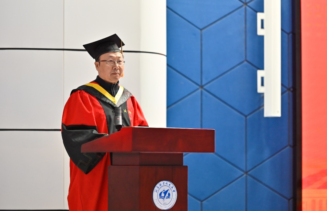 向顺利完成学业的硕士及博士毕业生表示热烈祝贺,向辛勤付出的研究生导师和教职员工致以衷心的感谢。他回顾了这几年动力学子与国同行所经历的大事,肯定了同学们勇敢追梦、全面发展。闫晓军提出三点希望与2024届研究生毕业生共勉:第一,爱党报国,勇担时代重任。人生的理想各有不同,但胸怀“国之大者”,服务国之所需,无疑是最为高远的志向。第二,终身学习,锤炼过硬本领。“学如逆水行舟,不进则退”。只有坚持勤奋学习,才能不断进步、持续成长。第三,团结拼搏,凝聚奋进力量。“独行者速,众行者远”。懂团结是人生大格局,能拼搏才能学到真本领。