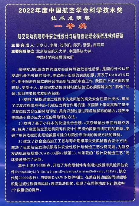 由丁水汀教授为领导核心的航空发动机复杂系统安全性与适航团队完成“航空发动机限寿件安全性设计与适航验证理论模型及软件研制”项目,获得2022年度中国航空学会技术发明一等奖。该项目联合中国民航大学及中国科虎扑足球